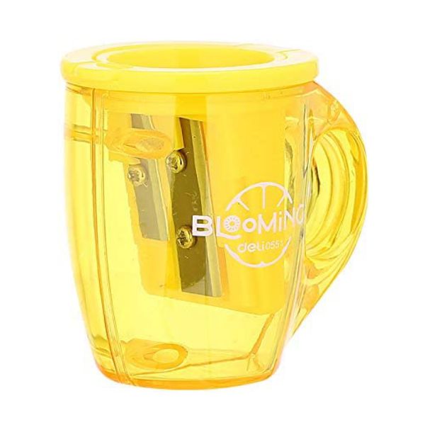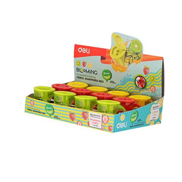 The Deli Two holes Cup Pencil Sharpener 0551 1Pc for standard pencils measuring 8 mm and another for jumbo-sized pencils measuring 12 mm. Each set comes in a vibrant kiwi green color, with a quantity of 3 sharpeners per pack. These sharpeners are versatile and can accommodate different pencil sizes, making them suitable for various needs.